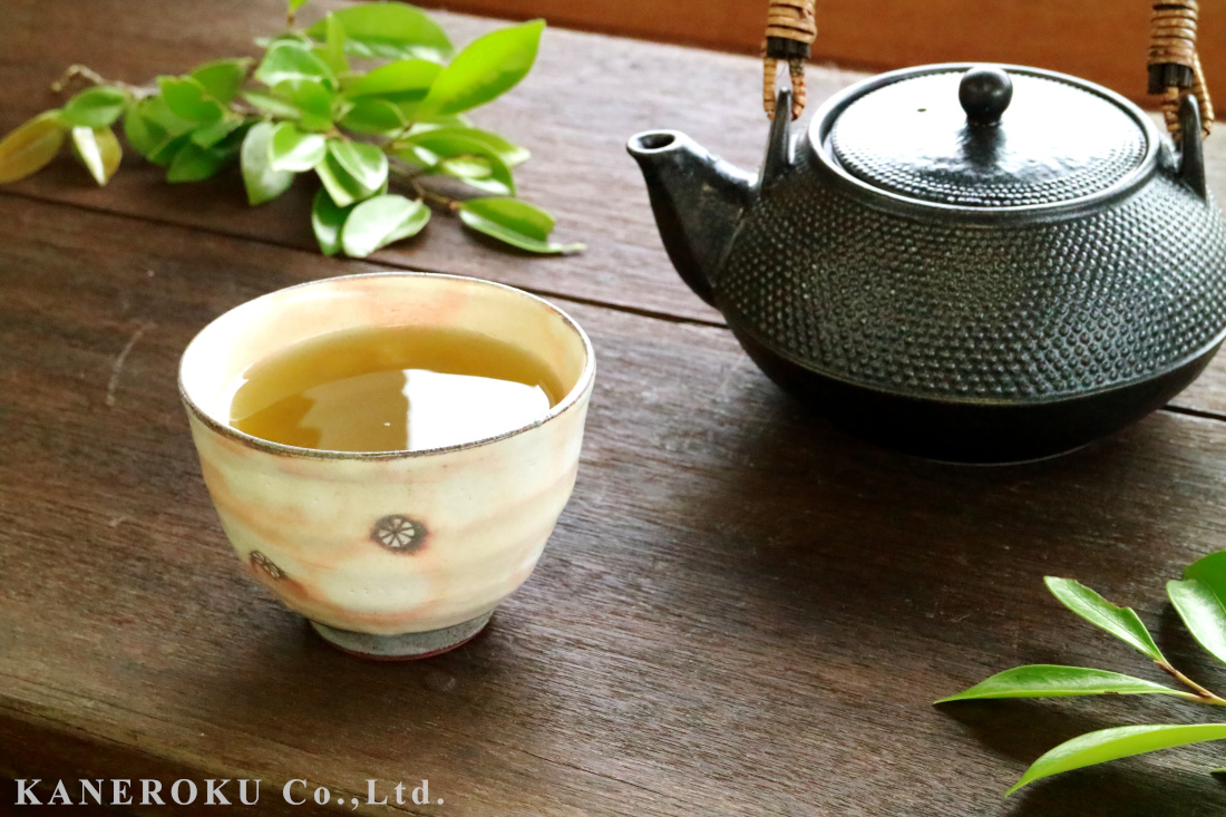 印花の柄がかわいい手作り湯呑です。特別変わった形ではないのかもしれませんが不思議と手に馴染む煎茶です。