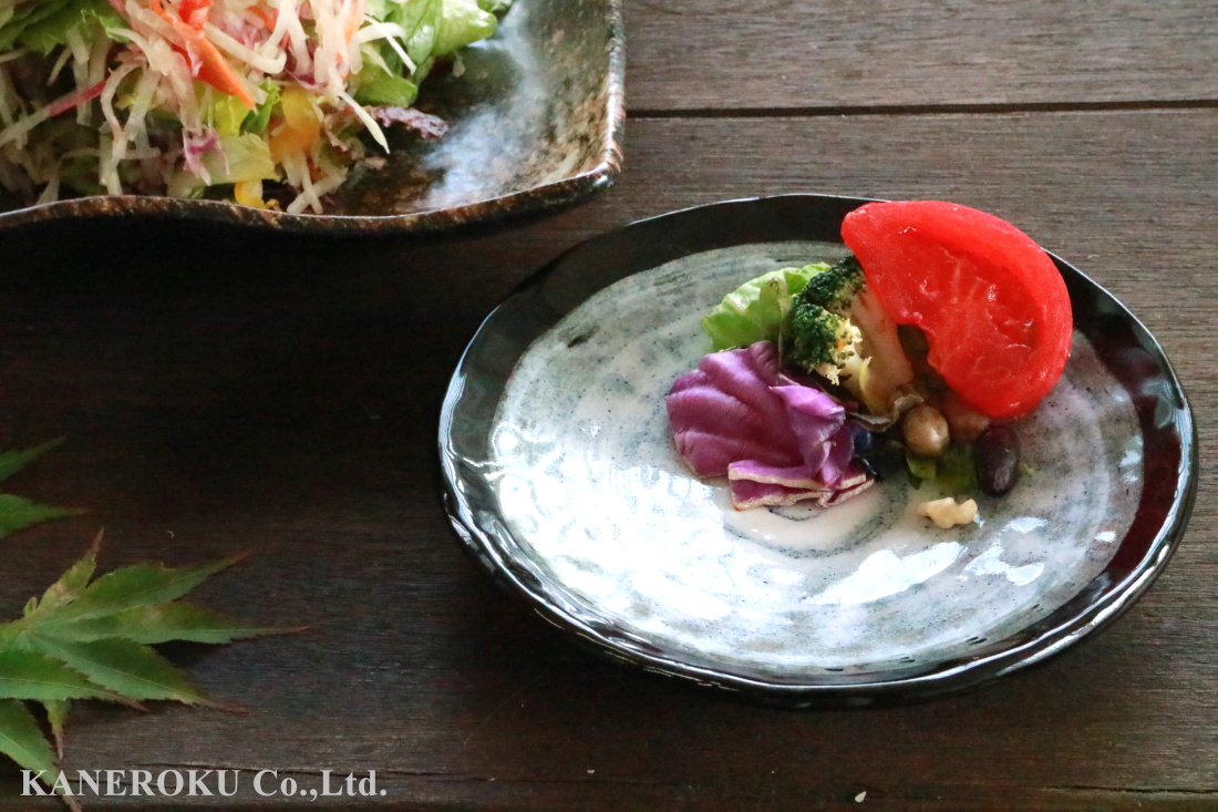 黒のボディにどこか流れる雲を感じる白の釉薬で塗られている取皿です。サラダでも煮物で焼物でもしっかり和のイメージを伝えてくれます。