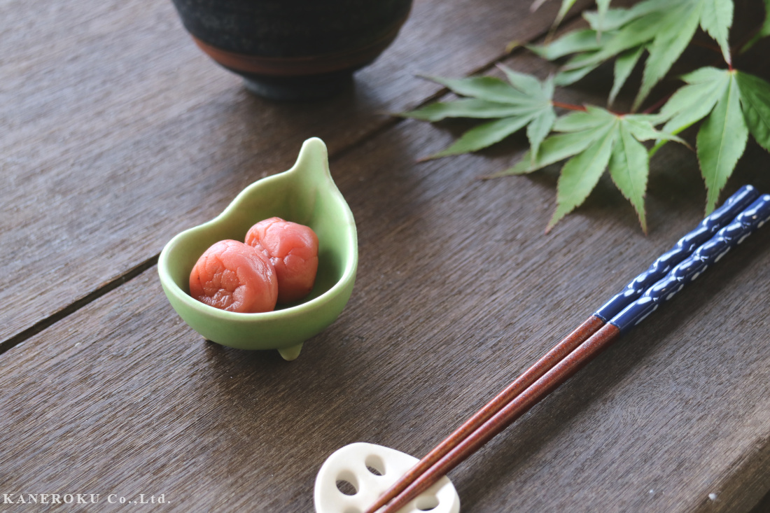 鮮やかなマットグリーンの珍味小鉢が食卓を華やかに彩ります。